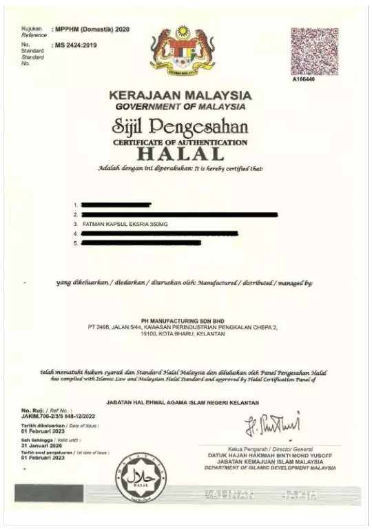 Dikeluarkan oleh kilang bertaraf GMP dan Halal. Dijaga kualiti dari awal sehingga ke pembungkusan untuk dikeluarkan ke pasaran Malaysia