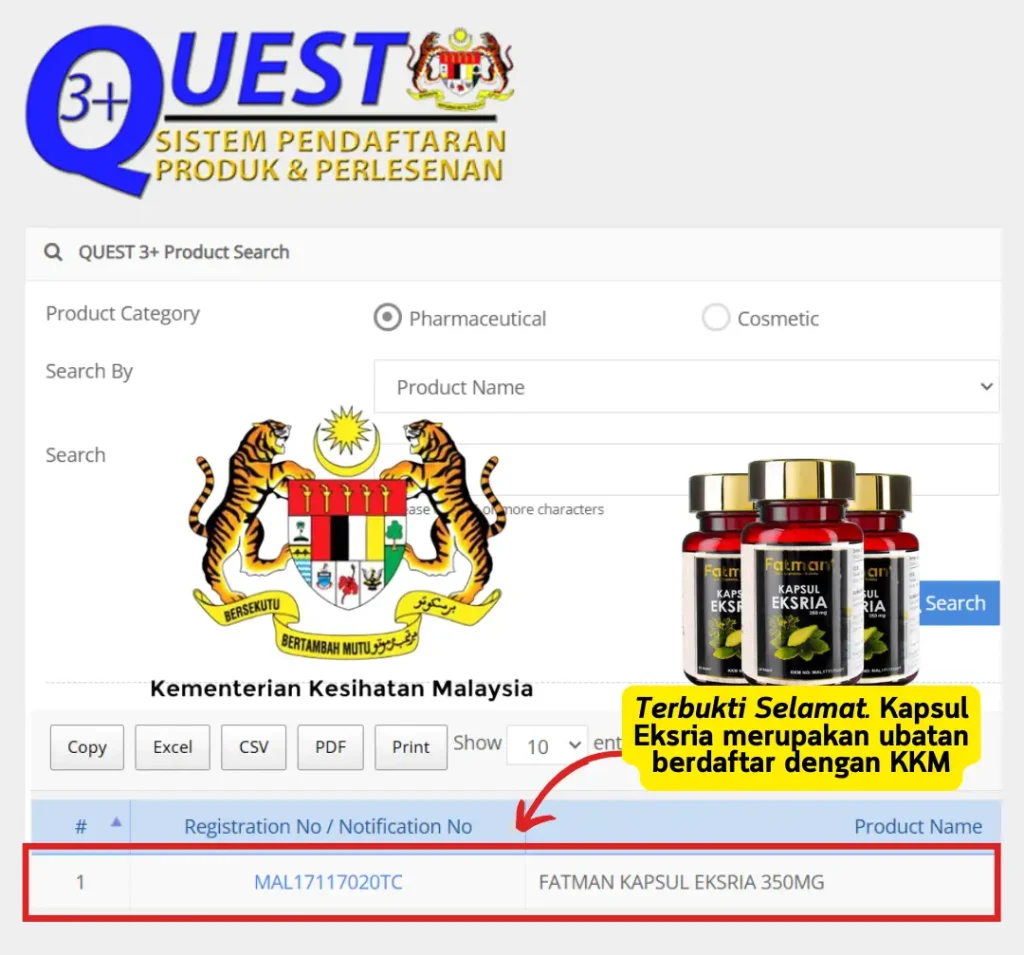 Kapsul Eksria Telah Berkelulusan Daripada KKM MAL dan Telah Dibuat Kajian Oleh penyelidik dari UTHM. Klik Link Dibawah Untuk Melihat Sijil KKM