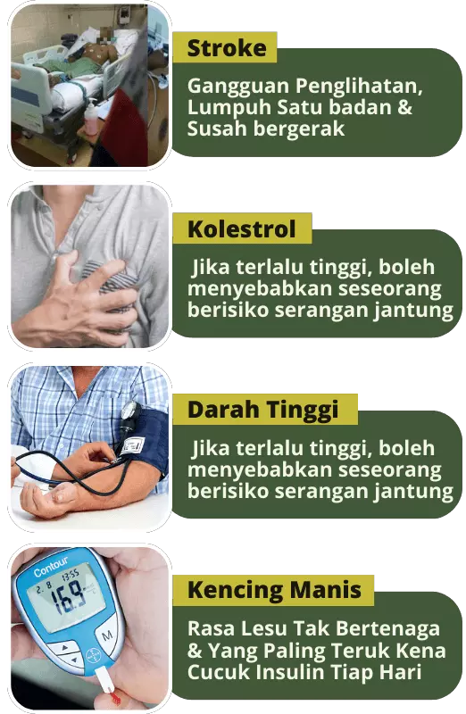 Lebih membimbangkan, 33.3% rakyat Malaysia menghidap kolesterol tinggi, 29.2% menghidap tekanan darah tinggi, dan 15.6% mempunyai penyakit kencing manis.